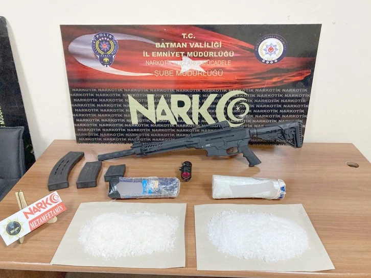 Bu kapsamda Narkotik Suçlarla Mücadele Şube Müdürlüğünce yapılan çalışmalar neticesinde, tespit edilen ikamette Cumhuriyet Savcısı’nın talimatları ile yapılan adli aramada; 2 adet paketlenmiş halde 1 Kilo 800 Gram Metamfetamin uyuşturucu madde, 1 adet uzun namlulu Silah, bu silaha ait 3 adet Şarjör ve 1 adet Dürbün ele geçirilmiştir.