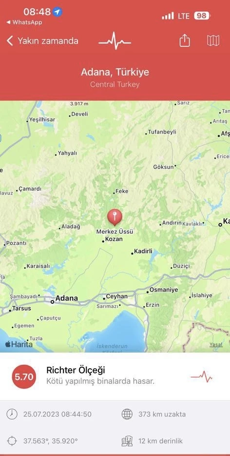 Gaziantep’te de aşırı derecede hissedilen Adana -Kozan merkezli 5.7 şiddetinde deprem meydana geldi. Deprem Gaziantep’te de şiddetli şekilde hissedildi.