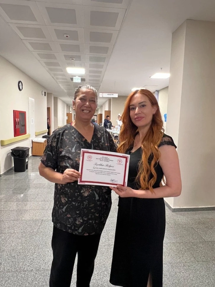 Başhekim Vekili Nigar Tepe Karakış ve hastane yönetimi 21-28 Nisan Ebeler Haftası münasebetiyle Ebelerin hem günlerini kutladılar hem de öz verili çalışmalarından dolayı Ebelere Teşekkür Belgesi takdim edildi.