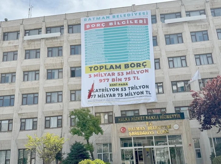 Batman'da 31 martta sandıktan birinci parti olarak çıkan DEM Parti, önceki dönemin borçlarını dev afişle belediye binasına astı. Batman Belediye binasına asılan dev pankartta vergi borçları, kurumlar, esnafa ödenmeyen borçlar, müteahhitlere ödenmeyen borçlar, ihalesi yapılmış işlerin borçları ve iller bankasından alınan krediler, rakamlarla tek tek sıralandı. Afişte yer alan bilgiye göre Batman Belediyesinin 3 milyar 53 milyon 977 bin 75 TL borcu bulunuyor.