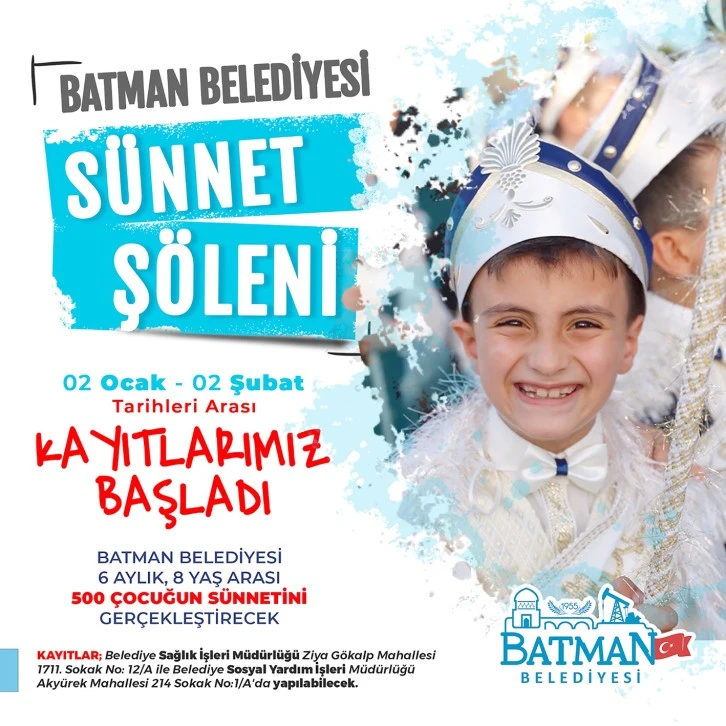 Erkek çocuklarını sünnet ettirmek isteyen vatandaşlar, 2 Ocak 2024 tarihi itibariyle hafta içi saat 10.00-12.00 ve 14.00-16.00 saatleri arasında 02 Şubat 2024 tarihine kadar Batman Belediyesi Sağlık İşleri ve Sosyal Yardım İşleri Müdürlüğü’nde kayıtlarını yaptırabilirler.