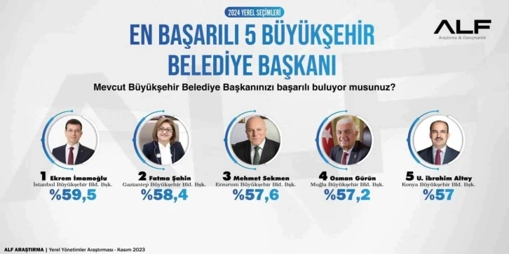 Bir araştırma şirketi 20 Ekim-3 Kasım 2023 tarihleri arasında Türkiye genelinde en başarılı büyükşehir belediye başkanları konulu araştırma yaptı. Yapılan araştırmanın sonuçları açıklandı. Açıklanan sonuçlara göre Gaziantep Büyükşehir Belediye Başkanı Fatma Şahin, Türkiye’deki en başarılı ikinci büyükşehir belediye başkanı olarak dikkat çekti.