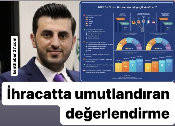 2023 Yılı Ocak - Haziran Ayı İnfografik Analizlerini paylaşan Acar, sözlerine şöyle devam etti; “Dünya genelinde en fazla ihracat yaptığımız ilk 5 ülke sırasıyla Almanya, ABD, İngiltere, İtalya ve Irak oldu. İhracatımız 123 milyar 377 milyon dolar oldu. Irak’a yapılan ihracatımız 5 milyar 675 milyon dolar oldu. Dünya genelinde en fazla ihracat yaptığımız sektörler sırasıyla; Kimyevi Maddeler ve Mamulleri, Hazır Giyim ve Konfeksiyon, Otomotiv Endüstrisi, Elektrik ve Elektronik.