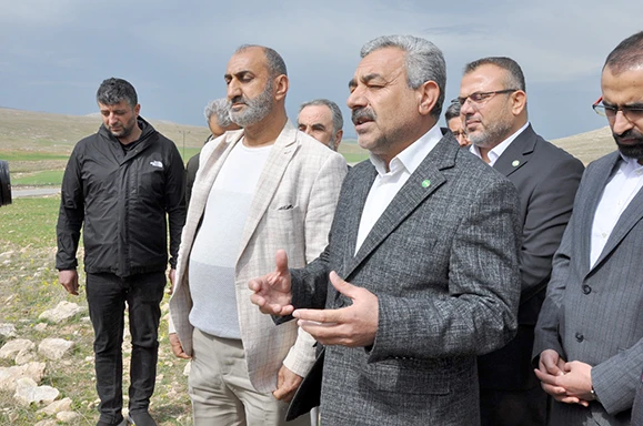 HÜDA PAR Batman İl Başkanı Davut Şahin ve Kasaplar Derneği Başkanı Ali Rüzgar, Hayvancılık Organize Sanayisi için tahsis edilmiş arazide basın açıklaması yaparak, askıya alınan projenin hayata geçirilmesini istediler.