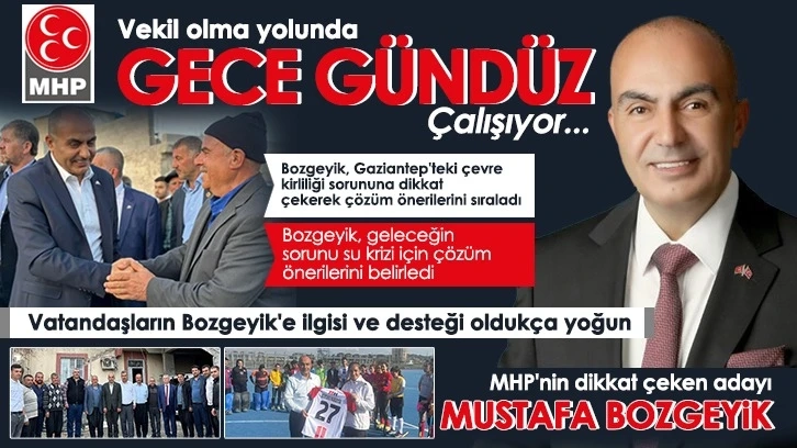 Yıllarca MHP Gaziantep teşkilatının her kademesinde görev alarak emek veren ve bu süreçte Şahinbey ilçe yöneticiliği, Ülkü ocakları il yöneticiliği, MHP Gaziantep il yöneticiliği, Şahinbey ülkü ocakları başkanlığı, il genel meclisi üyeliği, Oğuzeli belediye meclis üyeliği, Oğuzeli Belediye başkan yardımcılığı, Gaziantep Büyükşehir Belediye Başkanı danışmanlığı, MHP Gaziantep il başkan yardımcılığı gibi pek çok zor görevin üstesinden başarıyla kalkan Mustafa Bozgeyik, şimdi de milletvekili olmak için çalışmalarına kesintisiz devam ediyor.