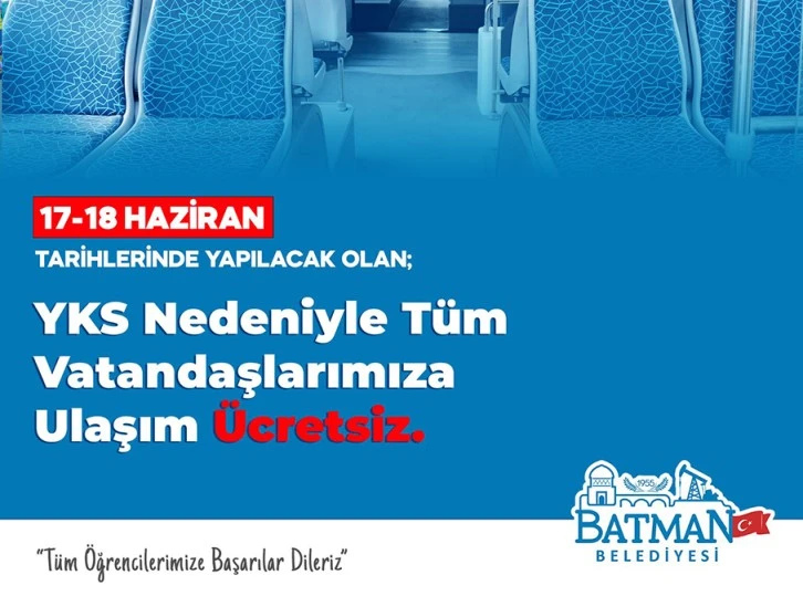 Türkiye genelinde olduğu gibi Batman’da da 17-18 Haziran 2023 Cumartesi ve Pazar günleri yapılacak olan Yükseköğretim Kurumları Sınavı’na girecekler için Batman Belediyesi otobüsleri ücretsiz hizmet verecek.