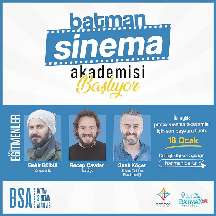 Batman Belediyesinden yapılan duyuruda “Sinema dünyasına adım atmak, bu alandaki bilginizi artırmak istiyorsanız, sizi de aramıza bekliyoruz. İki aylık pratik sinema eğitimimiz, alanında uzman eğitmenlerimiz Bekir Bülbül, Recep Çavdar ve Suat Köçer eşliğinde gerçekleşecek. Yönetmenlik, senaryo yazımı ve sinema tarihi ile sinema eleştirmenliği alanlarında, pratik ağırlıklı eğitim alma fırsatını kaçırmayın. Form doldurarak başvurunuzu tamamlayabilir ve sinema dünyasına ilk adımınızı atabilirsiniz” denildi.