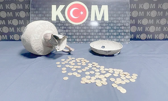 94 adet Tarihi Eser niteliğinde sikke, 1 adet Tarihi Eser niteliğinde testi ve 1 adet tas ele geçirilmiş olup; konu ile alakalı olarak 2 şüpheli şahıs hakkında 2863 Sayılı Kanuna Muhalefet suçu kapsamında işlem yapılmıştır. Kolay yoldan haksız ekonomik kazanç elde eden tüm suç organizasyonları ile mücadelemiz vatandaşlarımızın ihbar, şikâyet ve destekleri ile kararlılıkla devam edecektir” denildi.