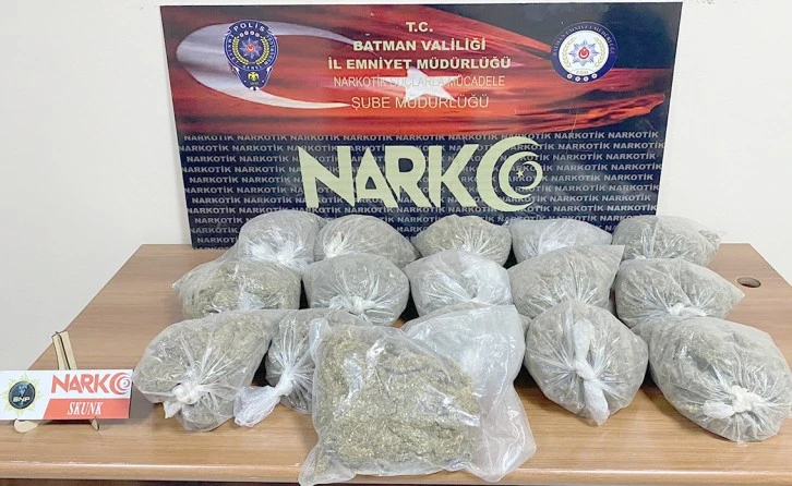 Batman’da durdurulan bir araçta yapılan aramada 16 paket halinde 8 kilogram skunk uyuşturucu maddesi ele geçirildi.