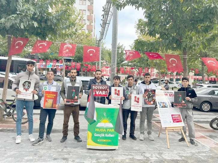 “İçtiğin kahvenin içinde bebek kanı var, kahrolsun İsrail!’ yazılı pankartlarla Batman Park önünde stand açıp eylem yapan HÜDA PAR üyesi gençler, trafik ışıklarında İsrail mallarını boykot broşürleri dağıttı.