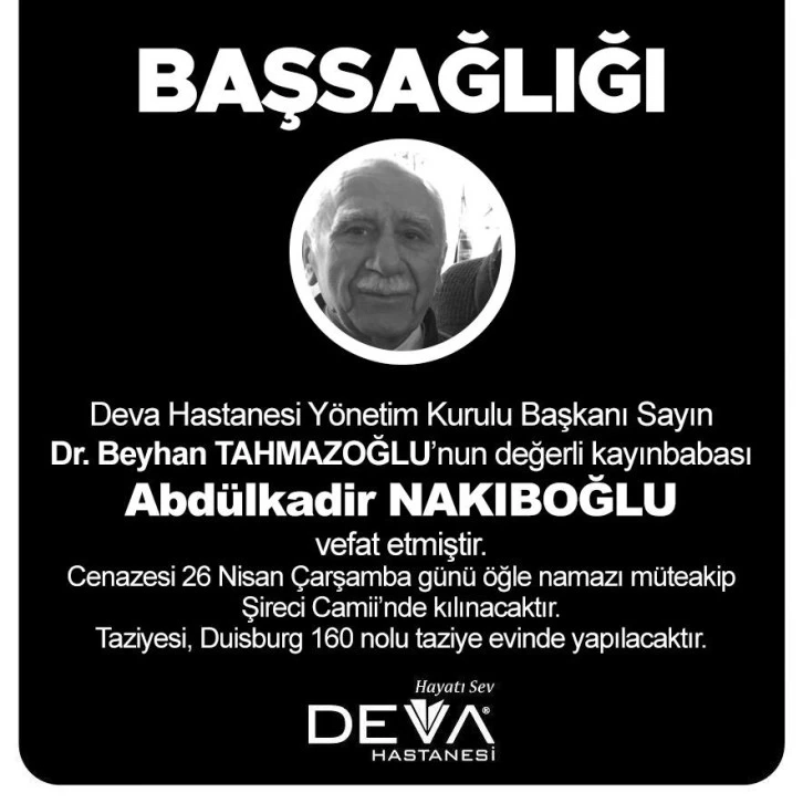 Gaziantep Organize Sanayi Bölgesinde yer alan Denge Tekstil firma sahibi Suat Nakıboğlu'nun da babası, Deva Hastenesi Yönetim Kurulu Başkanı Beyhan Tahmazoğlu’nun kayınbabası Abdulkadir Nakıboğlu’nun Cenazesi 26 Nisan 2023 Carsamba günü (BUGÜN) öğle namazına muteakip Şireci Camisi'nden kaldirilacak.