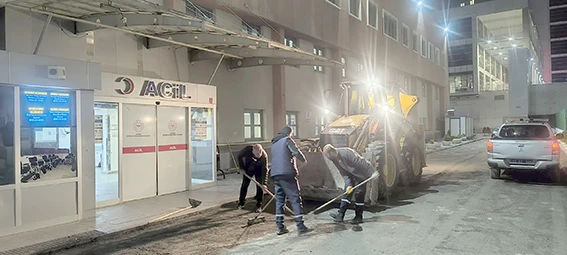 Vali ve Belediye Başkan Vekili Ekrem Canalp’in talimatıyla harekete geçen Belediye Fen İşleri Müdürlüğü, vatandaşların acil servis girişinde zorluk yaşamamaları için çalışmalarını gece saatlerine aldı.