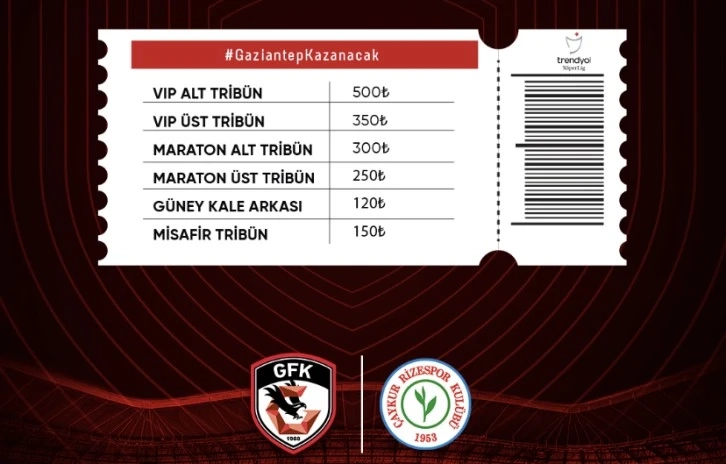 Gaziantep Futbol Kulübü'nün, Süper Lig'in 11. haftasında 6 Kasım Pazartesi günü saat 20:00'da konuk edeceği Çaykur Rizespor maçı biletleri satışa çıktı.