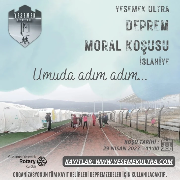 “İslahiye Ovası’nın güzel coğrafyasında geçen yıl toplamda 120 kilometrelik 5 farklı parkuru zorlu doğa ve hava şartlarına karşı dayanıklılık ve kendi kendine yetebilme özelliğini barındıran “Ultra TrailYarışı’nı depremden dolayı geçen yılki gibi gerçekleştirme şansımız olmadı Bu nedenle bu yıl Moral Koşusu olarak depremin en çok yıkıma uğrattığı ve bizim için büyük öneme sahip İslahiye ilçemizde 10 kilometrelik tek bir parkurda çadır/konteyner kentlerin arasında gerçekleştireceğiz. Yaklaşık 10 kilometrelik parkur boyunca çadır kentlerden geçip orada özellikle depremzede çocuklara ve vatandaşlarımıza moral vermeye çalışacağız. Kayıtlardan elde edilecek olan desteklerle depremzede ailelerimizin ihtiyaçlarını karşılamayı hedefliyoruz. Depremzede vatandaşlarımıza destek olmak isteyenleri bekliyoruz. Koşumuza destek olmak ve kayıt yaptırmak isteyenler, www.yesemekultra.com adresine giriş yapabilirler.”