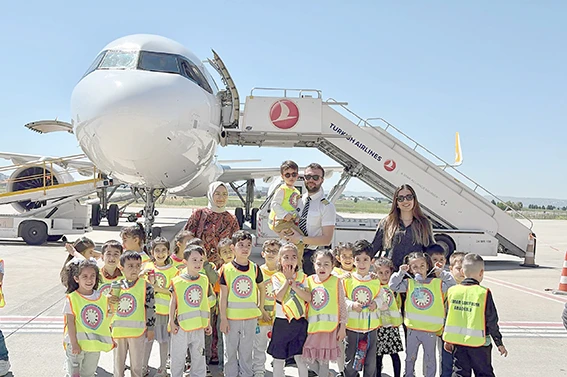 Havalimanı yetkilileri tarafından karşılanan öğrenciler, ilk olarak yolcuların terminaldeki geçiş süreçleri hakkında bilgilendirildi. Check-in kontuarlarından başlayan tanıtım turu, güvenlik kontrolü sonrası arındırılmış salonlarda devam etti. Öğrenciler, yolcu yönlendirme prosedürlerini yerinde gözlemledikten sonra apron alanına geçerek burada park halinde bulunan uçağı inceledi. Uçağın kokpitine girme fırsatı bulan öğrenciler, pilotlara merak ettikleri soruları yöneltti. Pilotlar da minik misafirlere uçuşla ilgili temel bilgiler vererek soruları yanıtladı. Ziyaretin bu bölümünde öğrenciler, kokpitte pilotlarla hatıra fotoğrafları çektirdi.