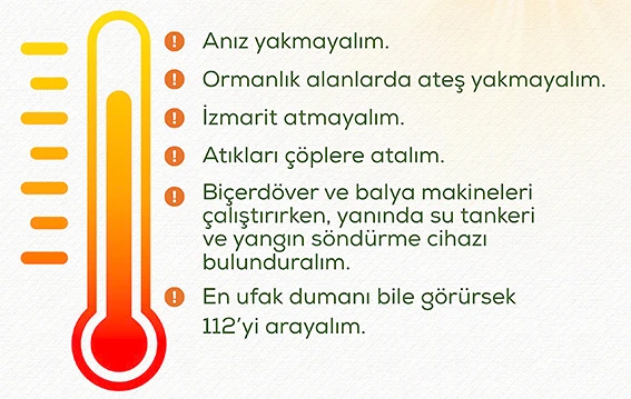 Açıklamada, yangına neden olabilecek davranışlardan kaçınılması gerektiği belirtilerek şu uyarılar yapıldı: Anız yakmayalım, Ormanlık alanlarda ateş yakmayalım, İzmarit atmayalım, Atıkları çöpe atalım. Biçerdöver ve balya makineleri çalıştırırken mutlaka su tankeri ve yangın söndürme cihazı bulunduralım. En ufak bir duman gördüğümüzde 112'yi arayalım.