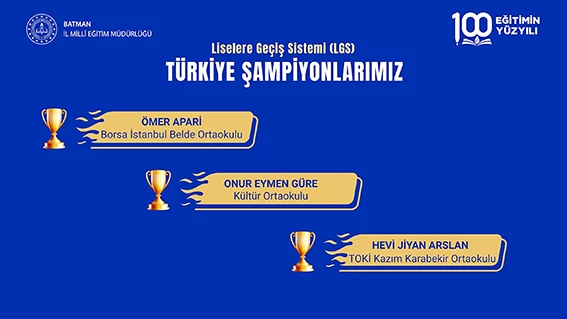 15 Haziran 2025 tarihinde gerçekleştirilen Liselere Geçiş Sistemi (LGS) Kapsamındaki Merkezî Sınav sonuçlarına göre, ilimizden 3 öğrencimiz 500 tam puan alarak Türkiye birinciliği elde etti.
